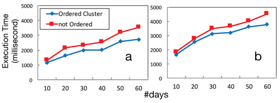 Figure 10 shows the differences between searching clusters ordered by number of CBs versus not ordered. As it has been shown, there is a slight improvement in the search execution time, especially when the number of days increases. This result is in line with our initial hypothesis, and thus ordering clusters based on their CBs can reduce the search execution time.