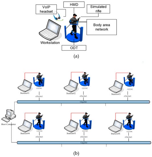Xsens Co. have been developing inertial BANs to track human movement for several years. Although the inertial BAN, called the MVN system, is able to capture human body motions wirelessly without using optical cameras, the 60 Hz system update rate is too slow to record fast-moving human motion. The latest Xsens MVN suit solved this problem, reaching a system update rate of 240 Hz. However, the MVN suit is relatively expensive in consumer markets. In addition, it is difficult to support more than four soldiers in a room with the MVN system, since the wireless sensor nodes may have unstable connections and high latency. On the other hand, since the Xsens MVN system is not an open-source system, the crucial algorithm of the inertial sensors does not adaptively allow the acquisition by and integration with the proposed real-time program. Moreover, the MVN system is only a motion-capture BAN and is not a fully functional training simulator with inertial BANs [].