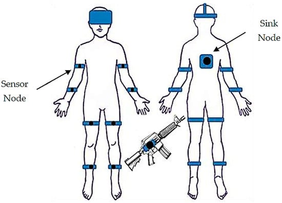 The sink node is deployed on the back of the body and collects the streaming data from multiple wireless sensor nodes. Afterwards, the streaming data from the sensor nodes is transmitted to the workstation via Ethernet cables, modeling the skeleton of the human body along with the structure of the firearm (Figure 12). Table 2 describes the data structure of a packet, which is sent by a sensor node to the sink node in every ODT. Table 3 shows the integrated data that describes the unique features of each soldier in the virtual environment. The description provides the appearance characteristics, locomotion, and behaviors of each soldier [,].