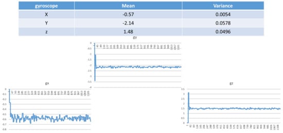 where is the true angular velocity, is the bias caused by low-frequency offset fluctuations, and the measurement error is assumed to be zero-mean white noise. As shown in Figure 5, the raw data of the measured gyroscope signals in the x, y and z directions includes true angular velocity, bias and error.
