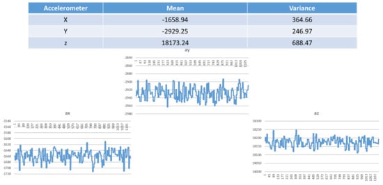 where is the linear acceleration of the body after gravity compensation, is the bias caused by low-frequency offset fluctuations, and the measurement error is assumed to be zero-mean white noise. As shown in Figure 6, the raw data of the measured accelerometer signals in the x, y and z directions includes true linear acceleration, offset and error.