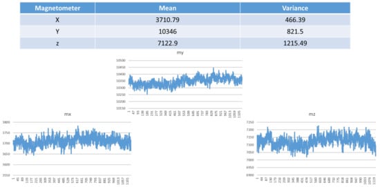 As shown in Figure 7, the raw data of the measured magnetometer signals in the x, y and z directions includes the earth’s magnetic field, offset and error.