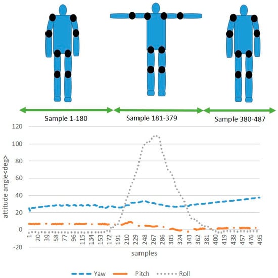 As shown in Figure 8, a typical run of the attitude angles of a sensor node placed on the upper arm when standing in a T-pose is recorded. In the first step, we stand with the arms naturally at the sides. Then, we stretch the arms horizontally with thumbs forward, and then we move back to the first step. This experiment shows that the sensor node is capable of tracking the motion curve directly.