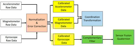 As mentioned above, human action recognition is crucial to developing an immersive training simulator. The wireless BAN is able to instantaneously track the action of the skeleton of a soldier. The microcontroller of the sensor node acquires the raw data from the accelerometer, gyroscope and magnetometer through SPI and I2C interfaces. The measurements of the accelerometer, gyroscope and magnetometer are contaminated by errors of scale factor and bias, resulting in a large estimation error during sensor fusion. Thus, a procedure for normalization and error correction is needed for the sensor nodes to ensure the consistency of the nine-axis data (Figure 9). After that, the calibrated accelerometer and magnetometer data can be used to calculate the orientation and rotation. Estimation based on the accelerometer does not include the heading angle, which is perpendicular to the direction of gravity. Thus, the magnetometer is used to measure the heading angle. the Euler angles are defined as follows: