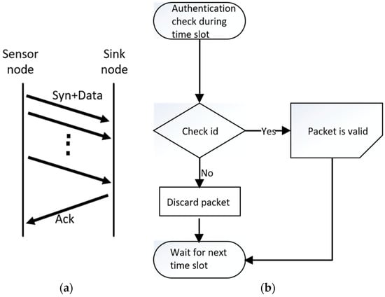 Operation mode during each time slot. (a) Step 1: automatic packet synchronization; (b) Step 2: identification check on valid packets by the sink node.