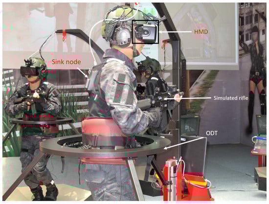 The proposed system, which is deployed in five-square-meter area (Figure 2), is a robust training solution that can support up to six soldiers. The virtual reality environment is implemented in C++ and DirectX 11. In addition to the virtual system, each individual soldier stands in the center of an ODT. The ODTs are customized hardware designed for the soldier training simulator, which is equipped with a high-performance workstation that generates the visual graphics for the HMD and provides voice communication functions based on VoIP technology. The dimensions of the ODT are 47” x47 “x78”, 187 lbs. The computing workstation on the ODT is equipped with a 3.1 GHz Intel Core i7 processor, 8 GB RAM, and an NVidia GTX 980M graphics card. The HMD is an Oculus Rift DK2, which has two displays with 960 × 1080 resolution per eye. The VoIP software is implemented based on Asterisk open-source PBX. Soldiers are not only outfitted with HMDs, but also equipped with multiple inertial sensors, which consist of wearable sensor nodes (Figure 3) deployed over the full body (Figure 4). As depicted in Figure 3, a sensor node consists of an ARM-based microcontroller and nine axial inertial measurement units (IMUs), which are equipped with ARM Cotex-M4 microprocessors and ST-MEMS chips. Note that these tiny wireless sensor nodes can work as a group to form a wireless BAN, which uses an ultra-low power radio frequency band of 2.4G.