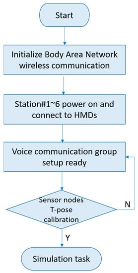 Although sensor nodes are always worn on certain positions of a human body, the positions of sensor nodes may drift due to the movements occurring during the training process. Hence, the T-pose calibration procedure can be applied to estimate the orientation of the sensors. After that, the system is prepared to log in for simulation tasks. The system initialization flow diagram is shown in Figure 13.