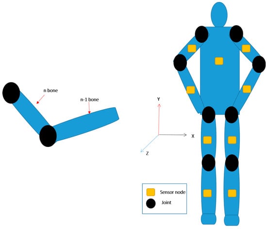 where is the translation matrix from sensor frame to body frame. According to [,], therefore, the transformation matrix of a human body from the first segment to the n-th segment is