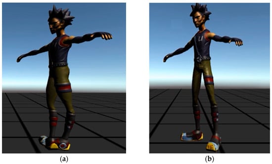 Sensing measurement errors of the sensor nodes were calibrated when the T-pose calibration was performed. (a) All sensor nodes were calibrated well during the T-pose procedure. (b) One sensor node attached to the right thigh was not calibrated well, and a sensing error was derived in the pitch direction.
