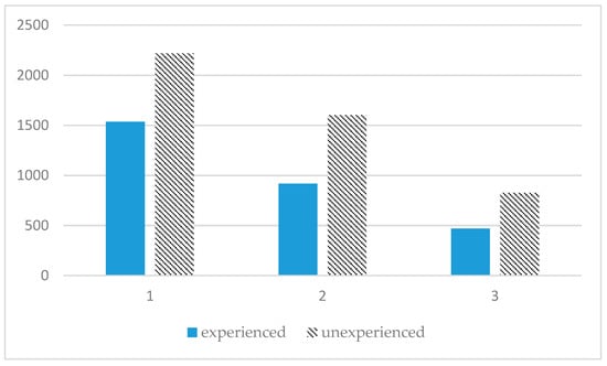 Means of experienced participants and unexperienced participants under various experimental conditions (horizontal axis: single-man, two-man, three-man; vertical axis unit: seconds).