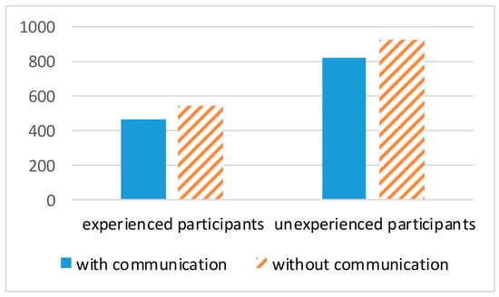 Mean of three-man teams with voice communication/without voice communication under the experimental conditions (horizontal axis: experienced/unexperienced participants; vertical axis unit: seconds).