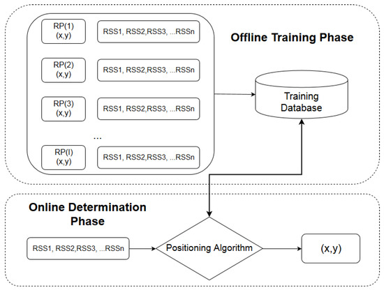 A different concept is adopted by fingerprinting methods. These methods are based on collecting off-line RSS measurements (fingerprints) from fixed beacons at multiple reference points in the indoor environment. Later, during the on-line localization phase, the current RSS measurements of the tracked device from the fixed beacons are compared to the collected database of fingerprints and the current location is estimated by considering the closest fingerprint matches, as seen in Figure 1 [13,14]. Classification techniques are utilized in order to perform fingerprint matching, such as k-nearest neighbors (kNN), support vector machines (SVM), Naïve Bayes [15] and neural networks [16]. Fingerprinting methods have the advantage of not requiring the knowledge of the positions of the fixed beacons. However, for exact localization, a large number of reference training points needs to be collected. Apart from the above broad categories, other methods include fusing measurements from multiple sensors available in smart devices, such as magnetometers, accelerometers, gyroscopes and ambient light sensors, to perform localization [17]. Measurement fusion is often accomplished through Kalman filters [18].