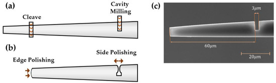 A Tescan (Lyra XMU) focused ion beam—scanning electron microscope (FIB-SEM)—was used to create a silica cavity in the MMF tip. The fabrication process is illustrated in Figure 1. First, the fiber end was cleaved with an ion current of nearly 1 nA. A 2 µm-wide, 7 µm-high air cavity was milled 60 µm away from the cleaved edge. At the position of the air cavity, the fiber has a diameter of 11.6 µm. The fiber edge was polished using the same current in order to produce a smooth surface that will act as a mirror through Fresnel reflection. During the milling of the cavity, some of the removed material is redeposited in the side walls, creating an irregular surface. Therefore, it is essential to polish the cavity walls to create smooth surfaces, preventing light from being scattered to the outside. The side polishing was performed with a current of 800 pA.