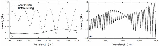 Figure 1 also shows a scanning electron microscope image of the final MMF probe. The fiber probe is comprised of a 2.7 µm-wide air cavity and a 60.2 µm-wide silica cavity being located between the air cavity and the polished fiber end. Note that the final height of the air cavity is 6.1 µm rather than the predicted 7 µm due to material redeposition during the milling process. Figure 2a shows the reflection spectrum of the structure before and after milling. In reflection, the silica and air cavities work as Fabry–Perot interferometers, and so the reflection spectrum presents an interferometric behavior.