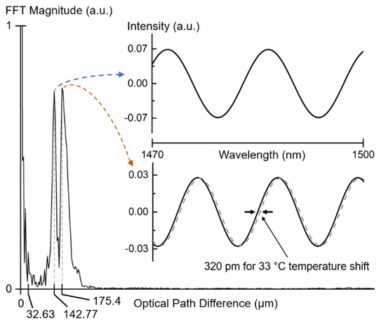 The superposition between the two main frequencies filtered from the reflection spectrum generates an envelope, due to the Vernier effect, that shows a wavelength shift with temperature, as presented in Figure 4. The envelope originates from the beating between the two main frequencies and presents a frequency that is equal to the difference between the frequencies of both components. Such frequency can also be seen in the FFT of the reflection spectrum (OPD = 32.63 μm). The temperature sensitivity of the envelope minimum is −670 pm/°C between 30 °C and 120 °C, much higher than the normal wavelength shift of the normal Fabry–Perot interferometer (9.7 pm/°C at 1485 nm, as shown in Figure 4).