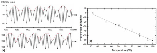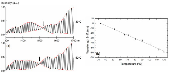 The reflected interferometric signal was measured by means of a supercontinuum optical source (Fianium, WL-SC-400-2, NKT Photonics GmbH, Cologne, Germany), an optical circulator, and an optical spectrum analyzer (OSA, Yokogawa Electric Corporation, Tokyo, Japan). For practical applications, alternative configurations involving less expensive commercial devices, for example, with a tunable laser can be implemented. The signal was previously normalized, with the reflected signal from a cleaved single mode fiber in air (around 3.5% Fresnel reflection) being taken as a reference. The fiber probe was submitted to different temperatures, ranging from 30 °C to 120 °C, in a tubular oven (Ströhlein Instruments). The position of the node was tracked, without the use of any filters, as a function of temperature by following the average of the minimum of the upper envelope and the maximum of the lower envelope. The wavelength shift of the node is depicted in Figure 5. A linear fit was applied to the experimental data, obtaining a temperature sensitivity of (−654 ± 19) pm/°C.