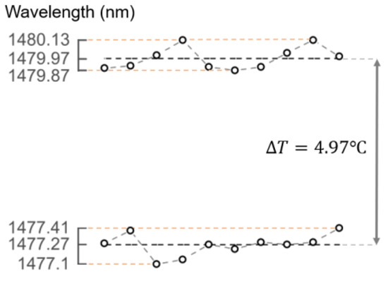 To evaluate the stability of the sensing structure and determine the detection accuracy, 10 consecutive measurements were performed at two different temperatures, 89.54 °C and 94.51 °C. To ensure a good thermal stability, the sensor was placed in an aluminum box inside a Carbolite oven with high volumetric capacity. The aluminum box partially attenuates the thermal fluctuations of the oven caused by its PID control. A PT100 thermometer was also placed inside the aluminum box together with the MMF probe to help in monitoring thermal stability. To make sure that a good thermal equilibrium was achieved, the oven was allowed to stabilize for 4 h at each temperature before the measurements were performed. The stability results are shown in Figure 6. The maximum standard deviation achieved was 96.98 pm, which corresponds to a detection accuracy of 0.14 °C. The value obtained corresponds to half of the OSA resolution used for the measurements (200 pm). Therefore, the resolution is limited by the resolution of the interrogation system. The theoretical detection limit for the fiber probe, while considering an interrogation system with a resolution of 10 pm, would be 0.015 °C. Such wavelength resolution can be achieved by modern high resolution OSA systems.