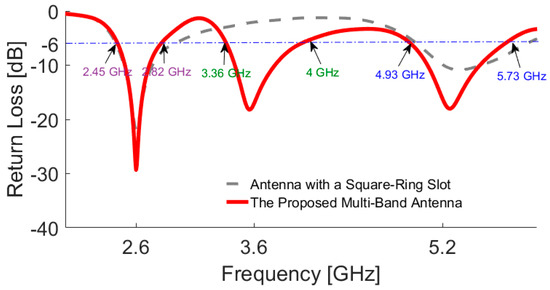 The motive behind the presented design is to achieve a compact multi-band antenna which can be integrated with a smartphone PCB. The return loss of the antenna with single and double-element square-ring slots is illustrated in Figure 2. The resonant frequencies of the antenna are mainly determined by the circumference length of the employed square-ring slots. The first resonance (at 2.6 GHz for the low-band) is mainly determined by the circumference of the outer square-ring slot. The second resonance (at 3.6 GHz for the middle-band) depends on the inner annular ring. Therefore, the circumference length of the square-ring slot needs to satisfy the dielectric wavelength at the corresponding frequency point, where W/2 + g = λ1 and W1/2 + g = λ2. However, the length of feed-line (Lf) also has a little effect on the frequency point. The third resonance (at 5.25 GHz for the upper-band) is the second harmonic of the outer square-ring. It should be also noted that the second harmonic of the inner square-ring occurs above 7 GHz and is not discussed in this study.