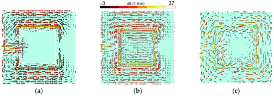 In order to further understand the triple-band characteristic, simulated surface current densities at 2.6, 3.6, and 5.25 GHz are shown in Figure 3. The maximum scale for each plot is the same. As seen in Figure 3a, the current flow reverses on the interior edge of the first resonator (2.6 GHz). The second resonator (second square-ring slot) has high current density and appears very active at 3.6 GHz, as shown in Figure 3b. At 5.25 GHz, Figure 3c shows that the exterior of the first resonator is more active, and most of the current is concentrated around it since it is the second harmonic of the first resonator [20]. However, there is always some coupling between the employed square-ring slots, and the frequency response of the antenna is a result of these complex interactions.