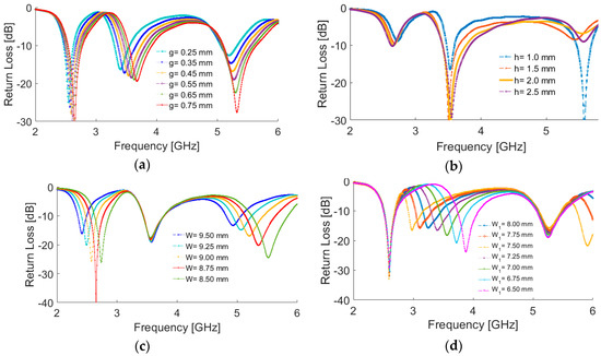 Return loss results for different values of (a) g (square-slot width), (b) h (substrate thickness), (c) W (the size of the first square-ring resonator), and (d) W1 (the size of the second square-ring resonator).