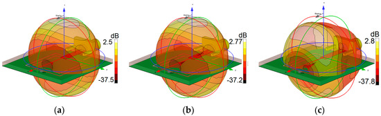 3D Radiation pattern results in Talk-Mode at (a) 2.6 GHz, (b) 3.6 GHz, and (c) 5.25 GHz.