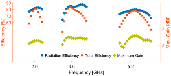 Maximum gain and efficiencies of the triple-band slot antenna.