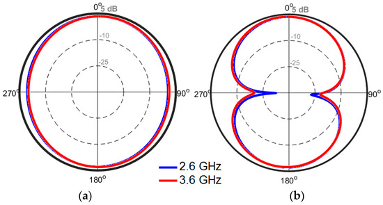 The 2D-polar radiation patterns of the antenna at 2.6 GHz and 3.6 GHz are illustrated in Figure 7. The antenna provides a nearly omnidirectional radiation patterns in the H-plane, while an 8-shaped radiation pattern in the E-plane has been achieved for different resonant frequencies. To verify the obtained results from the simulations, a prototype was fabricated and tested. Figure 8a,b shows the top and bottom views of the prototype, respectively. The simulated and measured results of the antenna return loss are illustrated in Figure 9. As seen, with a −10 dB impedance bandwidth, the antenna can cover the frequency bands of 2.5–2.7 GHz, 3.45–3.8 GHz, and 5–5.45 GHz with better than −18 dB return loss over all bands. Furthermore, there is good agreement between simulation and measurement.
