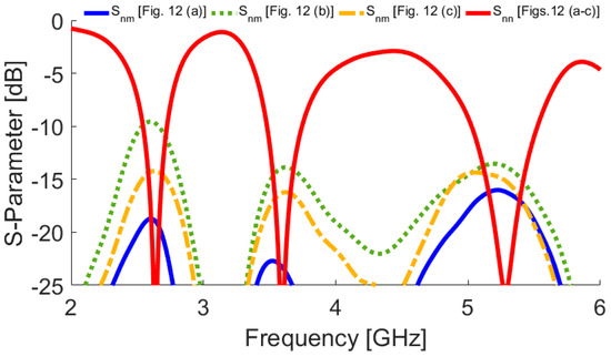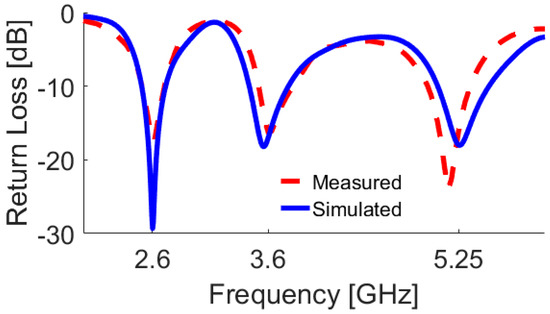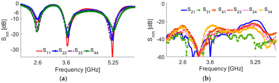 The measurement results of the antenna S-parameters are illustrated in Figure 18. As illustrated, good S-parameters have been obtained for all the double-element slot radiators of the design. In agreement with the simulations, the prototype provides triple-band characteristics at 2.6, 3.6, 5.25 GHz resonant frequencies. In addition, high-isolation and low mutual-coupling properties have been achieved.