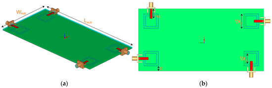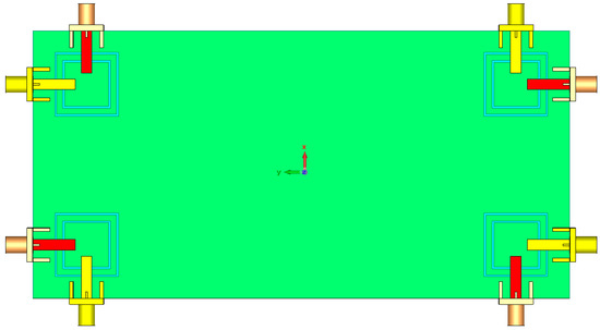 The antenna is illustrated in Figure 10. It is constructed on a commercially available FR-4 dielectric substrate with a dimension of 75 × 150 × 1.6 mm3. As illustrated, four elements of the proposed triple-band double-element square-ring slot radiators are placed at the four corners of the smartphone PCB. Since each radiation element of the proposed MIMO system can work separately as transmitter and receiver, it is not necessary to include the feeding network. However, for phased array designs such as millimeter-wave 5G antennas, the feeding network should be included in the final design [22]. The simulated S-parameters are shown in Figure 11: the radiation elements of the antenna provide similar performance with high impedance matching at 2.6, 3.6, and 5.25 GHz. In addition, the maximum mutual coupling is less than −17 dB.