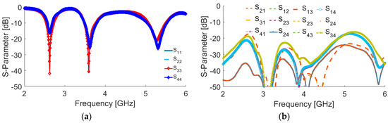 Simulated S-parameters (a) Snn (input-impedance) and (b) Snm (maximum mutual coupling).