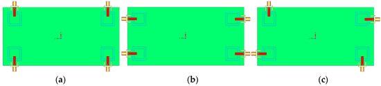 Different placement of the employed rectangular microstrip feed lines. (a) first, (b) second, and (c) third (the proposed).