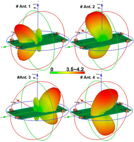 3D radiation patterns of the antenna elements at the resonant frequencies (2.6, 3.6, and 5.25 GHz) when held by both hands are shown in Figure 23. Generally, a user’s hand reduces the radiation performance of the antenna, but for the proposed antenna, as illustrated, the radiation patterns retain sufficient gain and pattern coverage. The minimum gain value is obtained for #Ant. 4 at 5.25 GHz. The antenna elements provide different gain values, varying from 0.75 dB to 3.15 dB IEEE gain.