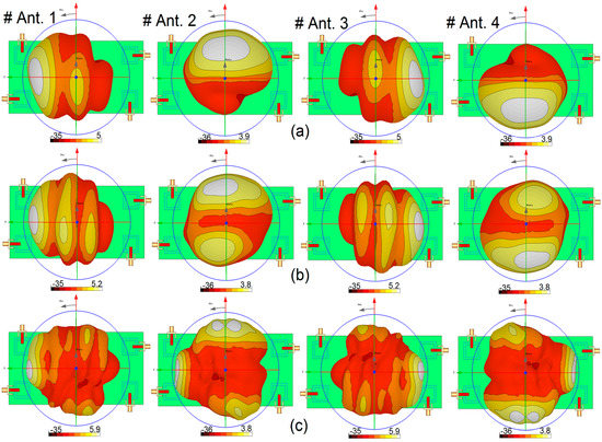 The configuration of the antenna with different placements of the microstrip feed lines are shown in Figure 12. Figure 13 depicts their Snn (input-impedance) and Snm (maximum mutual coupling) characteristics. It is evident that with these placements of its feed lines, the proposed design exhibits the lowest mutual coupling of less than −19, −23, and −17 dB coupling at 2.6, 3.6, and 5.25 GHz, respectively. The radiation pattern of the antenna elements (with linear scaling) at the middle frequency (3.6 GHz) is shown in Figure 14. It is clear that the proposed design (Figure 12c) can provide good radiation coverage on different sides of the PCB, while this cannot be obtained using the other feed-line placements (Figure 12a,b).