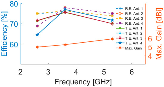 3D radiation patterns for each antenna element at different resonant frequencies are illustrated in Figure 15: each side of the smartphone PCB can be covered by the radiators with sufficient gain values. The antenna maximum gain and its radiation efficiency (R.E.) and total efficiency (T.E.) for the different radiators are illustrated in Figure 16. As can be seen, more than 75% and 65% radiation and total efficiencies are obtained for the elements at the resonant frequencies. The antenna also exhibits around 5–6 dBi maximum gain values at 2.6, 3.6, and 5.25 GHz.