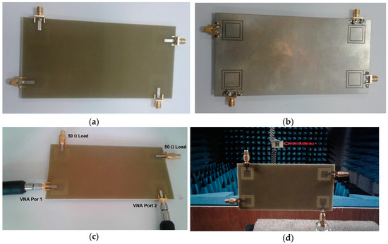 The proposed MIMO slot antenna design was fabricated, and its characteristics, including the S-parameters and 2D radiation patterns, were measured. The top and bottom views of the prototype are shown in Figure 17a,b. Figure 17c,d shows the measurement setups for the S-parameter and 2D radiation pattern measurements.