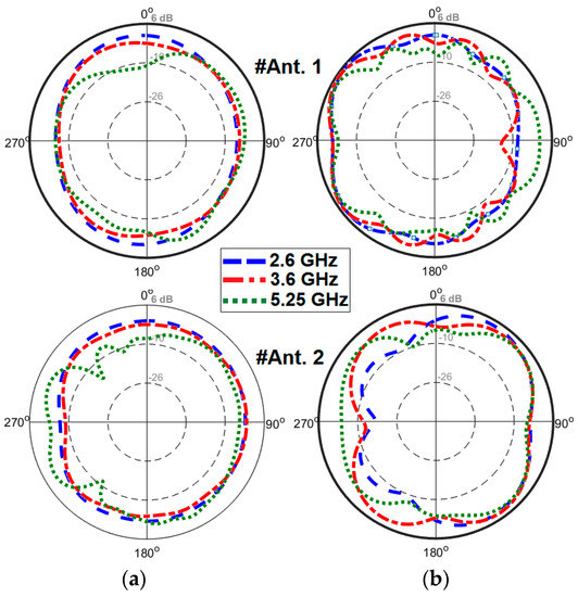 2D-polar radiation patterns of the antenna at different resonant frequencies are depicted in Figure 19. Figure 19a shows that omnidirectional radiation patterns are achieved in the H-plane, especially at 2.6 and 3.6 GHz. The E-plane radiation patterns of the antenna, as shown in Figure 19b, look like an 8-shaped dumbbell due to the nature of the slot resonators. The envelope correlation coefficient (ECC) is an important parameter of the MIMO antenna system, quantifying its multiple port performance. A lower ECC means more diversified patterns [23]. An acceptable standard for a desirable MIMO system is ECC < 0.5. Another important parameter which must be considered in these systems is the total active reflection coefficient (TARC), which is defined as the square root of the ratio of reflected power to incident power [24]. Figure 20 shows the ECC and TARC results from the simulations and measurements. The calculated ECC results indicate that ECC is within acceptable limits and is very low over the antenna operation bands. As illustrated, TARC is less than −40 at the resonant frequencies.