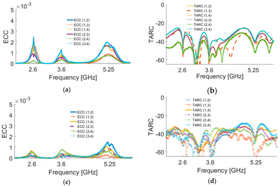 Simulated (a) envelope correlation coefficient (ECC) and (b) total active reflection coefficient (TARC), and measured (c) ECC and (d) TARC results.