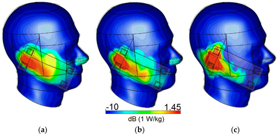 Simulated specific absorption rate (SAR) at (a) 2.6, (b) 3.6, and (c) 5.25 GHz.