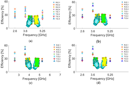 As shown, the antenna has low SAR values at 2.6, 3.6, and 5.25 GHz. The radiation efficiency and total efficiency of the antenna under different single hand modes are studied in Figure 22. The hand modes include right-hand mode on the top of PCB (RHM-1), right hand mode on the bottom of PCB (RHM-2), left hand mode on the top of PCB (LHM-1), and left hand mode on the bottom of PCB (LHM-2). According to the simulations, the antenna elements show good performances in the vicinity of the user’s hand and provide good radiation and total efficiencies. The maximum reduction in the antenna efficiency usually occurs when the antenna element is partially covered by hand tissue.