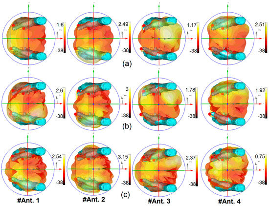 3D Radiation patterns of the antenna elements in the present of both user’s hands at (a) 2.6 GHz, (b) 3.6 GHz, and (c) 5.25 GHz.