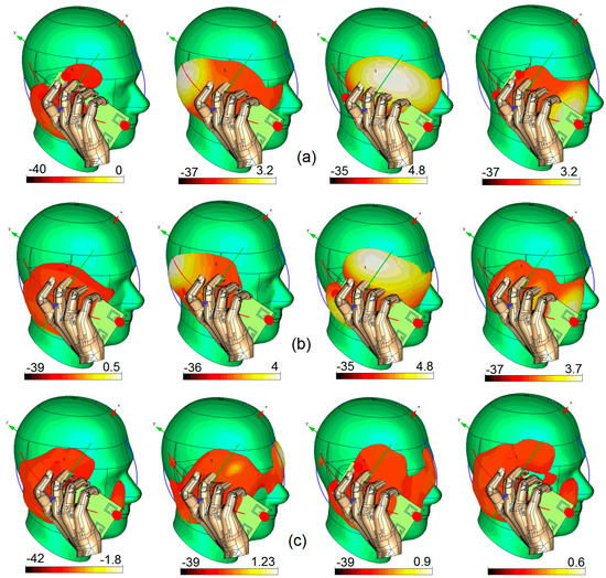In this section, the specific absorption rate (SAR) characteristic and the user-impact on the radiation characteristics of the antenna system are reported. SAR, one of the most critical issues of mobile terminal systems, is a measure of electromagnetic radiation absorbed by a human body, and should be as low as possible [25,26]. Figure 21 illustrates the simulated SAR characteristic in the vicinity of a human head for different resonant frequencies. The smartphone PCB has been placed with less than 10 mm distance of the user’s head.