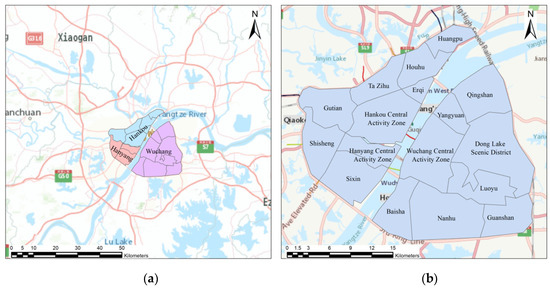 Study area: (a) the geographical location of the three towns of Wuhan in the map of China; (b) the planned urban clusters of Wuhan.