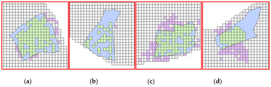 The typical detected clusters for each type in Table 5, in which the purple grid cells represent the detected clusters; the blue polygons represent the corresponding planned clusters; the green grid cells represent the intersections. (a) The clustering result of Qingshan (Type 1); (b) the clustering result of Baisha (Type 2); (c) the clustering result of Guanshan (Type 3); (d) the clustering result of Ta Zihu (Type 4).