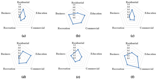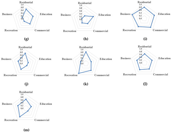 Radar chart of fulfilled demand indexes for cluster (a) C1, (b) C2, (c) C3, (d) C4, (e) C5, (f) C6, (g) C7, (h) C8, (i) C9, (j) C10, (k) C11, (l) C12, (m) C13, by five types of land-use functions.