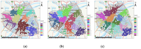 As shown in Figure 5, there are nine detected clusters in Figure 5a, 13 in Figure 5b, and 13 in Figure 5c, indicating that the number of detected clusters is approaching the number of planned clusters. In addition, the number of grid cells participating in the clustering process was 1397, 1563, and 1637 in Figure 5a–c respectively, also showing an increasing trend over time. This phenomenon is particularly evident in the area close to the third ring expressway, as shown in Figure 5. More specifically, several clusters close to the third ring expressway, such as Baisha, Nanhu, Sixin, and Shisheng, gradually formed and approached the shape of the corresponding planned clusters in the period 2009–2015, which suggests that the population of residents living there is increasing. This analysis reflects the spatial expansion of Wuhan.
