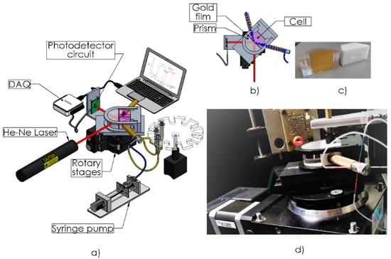 The SPR system employed in this study was modified from the instrument described previously by Sánchez-Alvarez et al. [18]. In short, the optomechanical setup was a homemade platform based on the Kretschmann configuration, consisting of two stacked and motorized rotation plates of 0.00025° of angular resolution, configurated to move synchronized according a θ–2θ system (one plate moves at twice the speed and reaches twice the degree rotation than the other) by a stepper motor. A hemicylindrical shaped glass prism BK7 was mounted on the base of the superior plate, meanwhile the photodetector (Si photodiode model S1226-8Bk with a signal amplifier circuit Hamamatsu, Bridgewater, NJ, USA) was assembled on the lower plate; allowing the capture of the reflected light, launched by a 632.8 nm p-polarized He-Ne laser (mod. 1101P, Uniphase, St. Charles, IL, USA) and that passes through the prism (Figure 1a). The intensity of the reflected light captured by the photodetector is later transformed into a voltage (range from 0 to 12 V) and collected using a DAQ device (USB 6003, 16 bits, National Instruments Mexico, Ciudad Juárez, México) with a resolution of 1.8 ×10−4 V·bit−1. The fluidic system consisted of a Teflon cell (depth of 1 mm and area of 16 mm2) with an inlet and outlet tube placed at 45 degrees. The entrance tube of the cell possesses four syringe tips (0.9 mm diameter) that allows the simultaneous injection of different solutions (Figure 1b,c). However, in this study only one syringe was employed, meanwhile the rest were blocked. The design of the Teflon cell allowed a laminar flow through its inner channel which possesses a diameter of 1.4 mm. The gold coated surface of the chip was pressed against the flow cell to allow the solutions came in contact with the gold. Meanwhile, the glass surface of the chip was optically matched to the prism (with its flat face downward) by using immersion oil (Figure 1d). The solutions were continuously delivered over the sensor surface by using a syringe pump (Legato 100) at a flow rate of 30 μL min−1. The communication between the SPR setup and the PC was achieved via an RS-422 serial link and controlled by a homemade graphical user interface programmed in LabView (National Instruments Mexico, Ciudad Juárez, México) to allow the data acquisition. The SPR setup possess an angular sensitivity of 172°/RIU, (using a BK7 prism coupled to a Cr/Au thin film) and a signal-to-noise ratio (SNR) of 7.42 db (decibels).