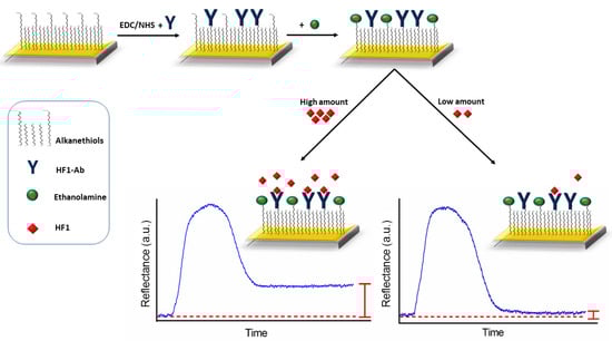 Then, the anti-HF1 was immobilized onto the gold surface using the EDC/NHS method [19]. Briefly, the immobilization of the antibody was accomplished by attaching the free amine groups of the anti-HF1 to the carboxylic terminal groups of the alkanethiol monolayer through an amide bond. The biofunctionalization was performed in-flow by delivering a solution of EDC/NHS (EDC 0.2 M/NHS 0.05 M) in MES buffer (100 mM, 500 mM NaCl, pH 5.0), followed by the injection of a solution of anti-HF1 (50 µg mL−1). Finally, a solution of ethanolamine (1 M, pH 8.5) was flowed over the sensor surface to allow the deactivation of the remaining unreacted carbodiimide esters. A conceptual overview of the immobilization procedure is observed in Figure 2.