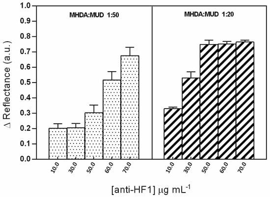 Long chain alkanethiols (mercaptohexadecanoic acid, MHDA; and mercaptoundecanol, MUOH) were employed to form a self-assembled monolayer (SAM) onto the gold layer substrate for its further use as a platform for the immobilization of HF1 polyclonal antibodies. According to Cheng et al. [21] the density of a mixed self-assembled monolayer (SAM) of alkanethiols (nitrilotriacetic acid thiol and oligo(ethylene glycol thiols), measured by XPS, ranged from 0.9 to 1.3 molecule/nm2. In our work we solely evaluated the formation of the SAM with terminal COOH through an indirect methodology published by [19,22], where the efficiency in the process of immobilization (which occurs through the activation of COOH moieties from the SAM) is measured in real time at fixed angle). In this case, the increment in the SPR reflectance corresponds to the increase of thickness in the film due to the density of immobilized molecules. The density of molecules immobilized on a surface for later use as a bioreceptor is an essential factor to consider for efficient detection; since a low density could lead to a poor recognition, meanwhile excessive amounts can result in steric hindrance, causing a deficient detection as well [22]. Thus, several antibody concentrations (anti-HF1 = 10, 30, 50, 60 and 70 µg mL−1) immobilized onto two molar ratios of a mixed SAM (MHDA: MUD = 1:20 and 1:50, total alkanethiol concentration 250 µM) were tested, obtaining maximum responses by using a ratio 1:20 of MHDA: MUD and 50 µg mL−1 of anti-HF1 (see Figure 3).