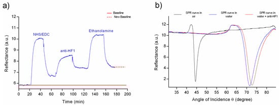 (a) Real-time SPR sensorgram of anti-HF1 immobilization. Activation by EDC/NHS; then immobilization of the polyclonal antibodies and finally blocking of the sensor surface by ethanolamine and (b) Angular reflectance spectra measured from a sensor chip before (blue) and after the immobilization (red) of anti-HF1.