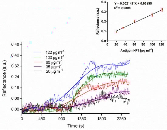 A direct binding immunoassay was performed under the aforementioned assay conditions. Different concentrations of HF1 ranging between 0 and 122 µg mL−1 were flowed over the anti-HF1 coated surface, followed by a washing step with PBS buffer once each concentration reached the plateau, saturation level in the signal response. The measurements were performed in triplicate and the average was fitted to a centered fifth order polynomial equation (y = β0 + β1x + β2x2…+ β5x5), where X is the value from the subtraction of the mean X from all X values before fitting and β are the values of Poisson model [26]. This fitting method is commonly employed to smooth and estimate the trajectory shape of curves from a group of data, in this case, the sensograms (see Figure 5). The analysis was based on least squares, obtaining in all the fittings a degree of correlation of R2 higher than 0.96. Then, the SPR signal value at the plateau (saturation by specific binding) obtained from the fitted trajectory curves were plotted as a function of HF1 concentrations to generate a calibration curve (see Figure 5). The limit of detection obtained was 11.7 µg mL−1 which is comparable to that obtained by Torrance et al. [27], where used an antibody-based SPR for the detection of Cowpea mosaic virus, establishing a limit of detection of 12.5 µg mL−1 as well as the LOD of 10 µg mL−1 obtained by Otero et al. [28] who employed a monoclonal antibody-based on a triple antibody system-ELISA for the detection of Mycosphaerella fijiensis. The primary analytical parameters obtained in this study are summarized in Table 1. Currently, there is a lack of analytical tools that address the detection of fungus and bacteria as plant pathogens, since SPR-biosensors have been mainly limited to detection of plant viruses such as Cymbidium mosaic virus, Odontoglossum ringspot virus [29], Cowpea mosaic virus [27], Tobacco mosaic virus, Lettuce mosaic virus [30]. In particular, this research represents the first approach to the fabrication of robust SPR platform for routine monitoring and early detection of P. fijiensis, the causative agent of plant disease black Sigatoka in banana plantations.